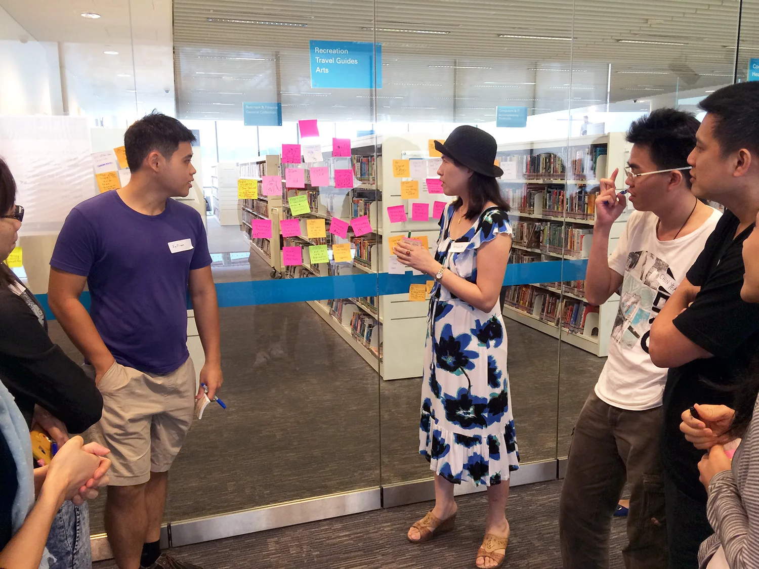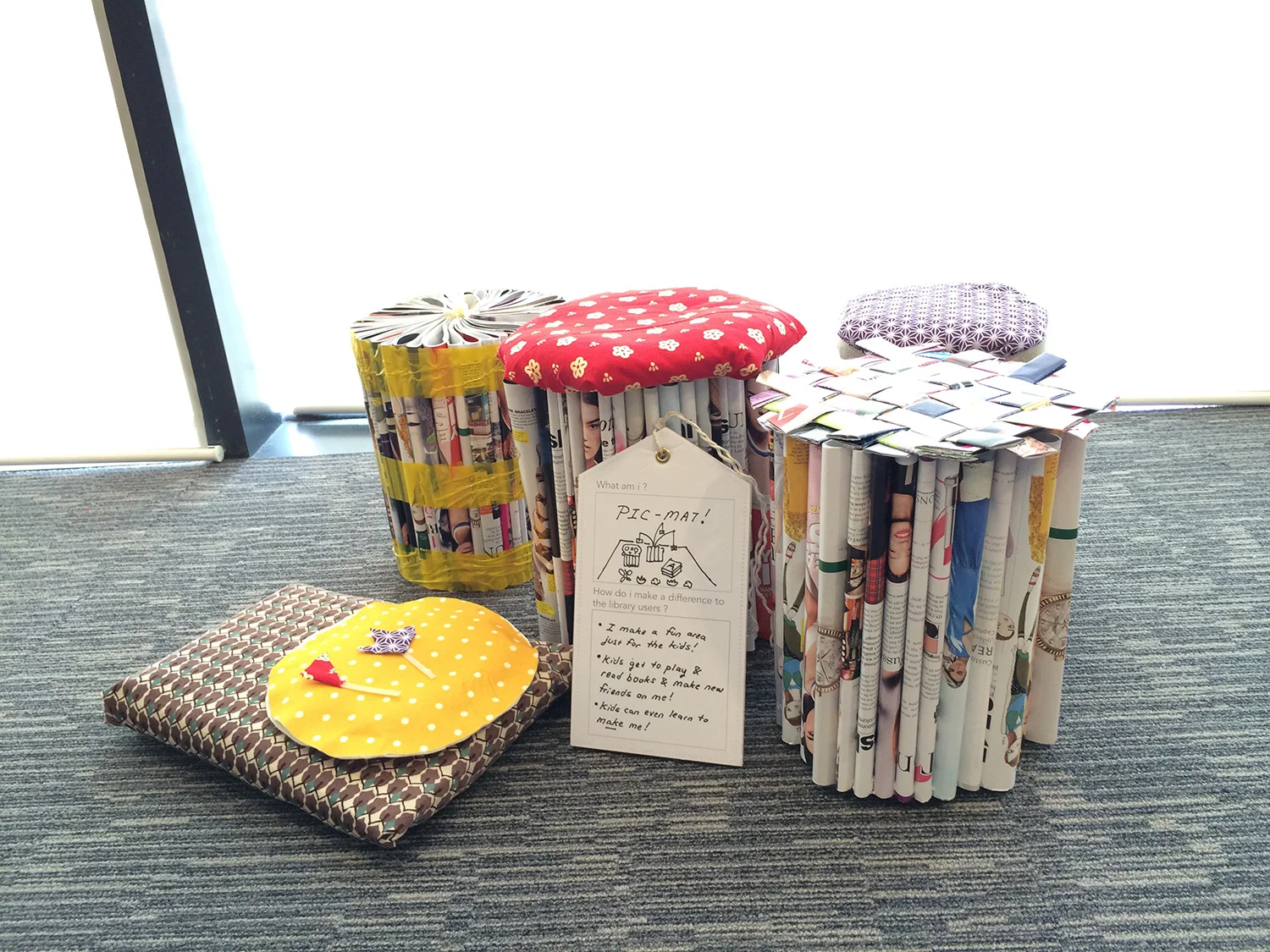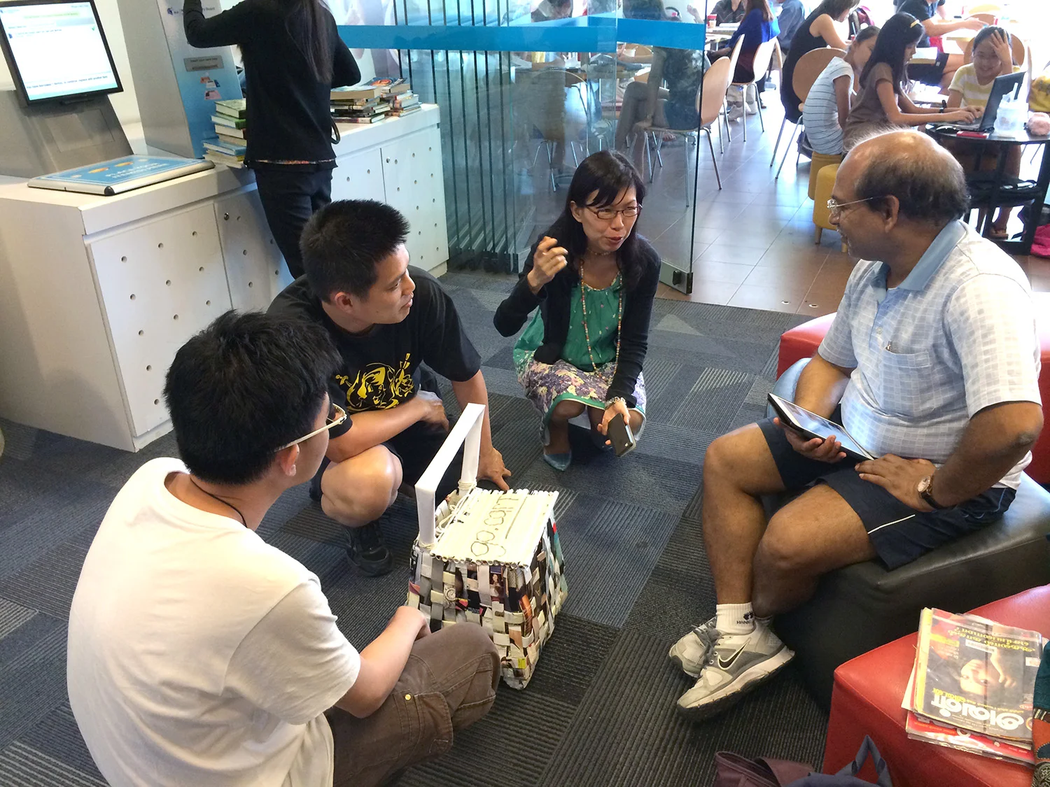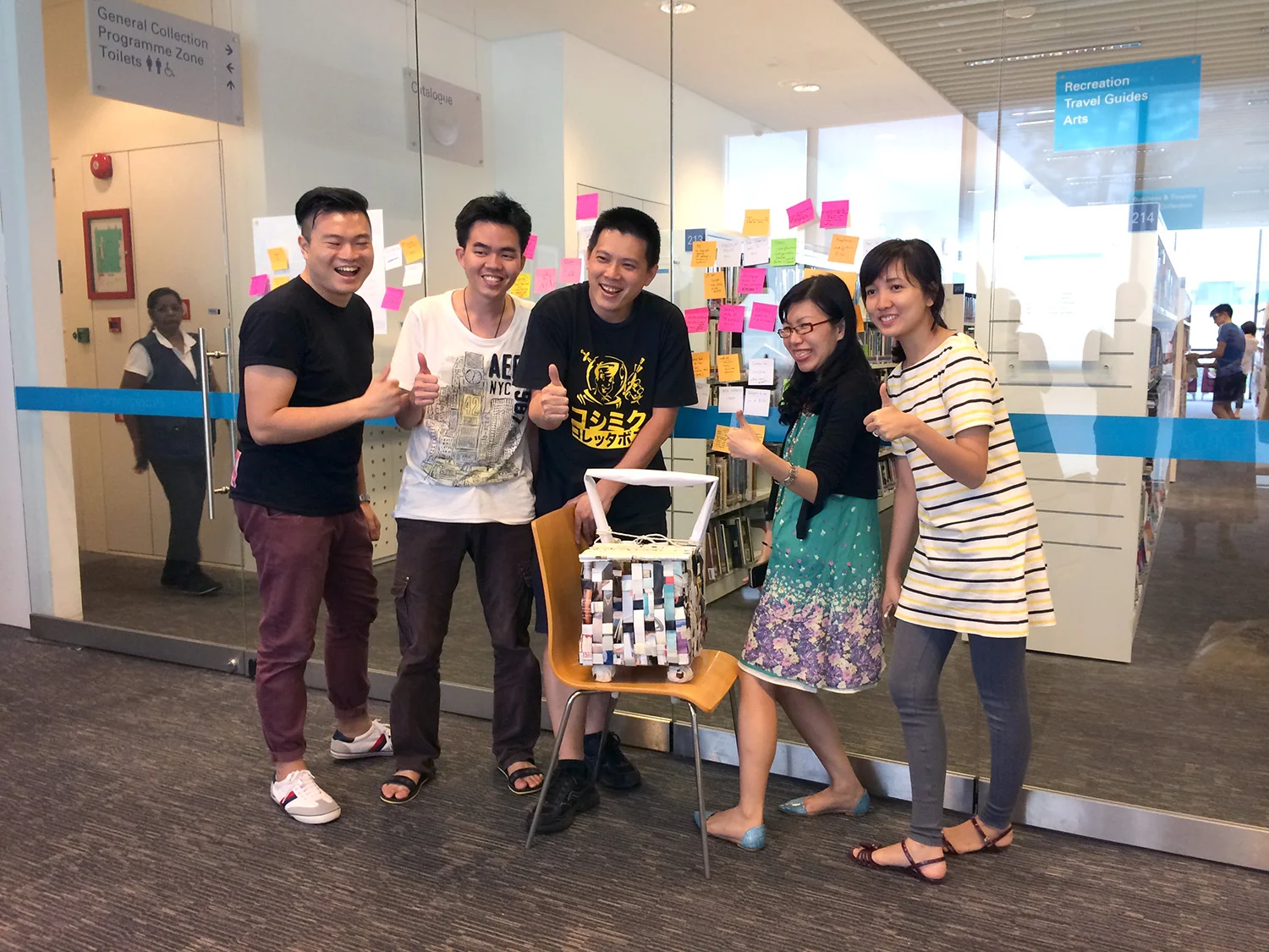 Our participants brought such great energy and enthusiasm to the workshop, and took to each part of the programme with gusto - from on-site fieldwork which involved engaging library users on their needs and experiences, to brainstorming, developing and prototyping design ideas using upcycled materials. And because participatory design is about seeing everyday people as legitimate stakeholders and involving them at every step of the process as far as possible, we 'live' tested the prototypes with the library users at the end of the two days to seek their feedback on how to improve the designs.